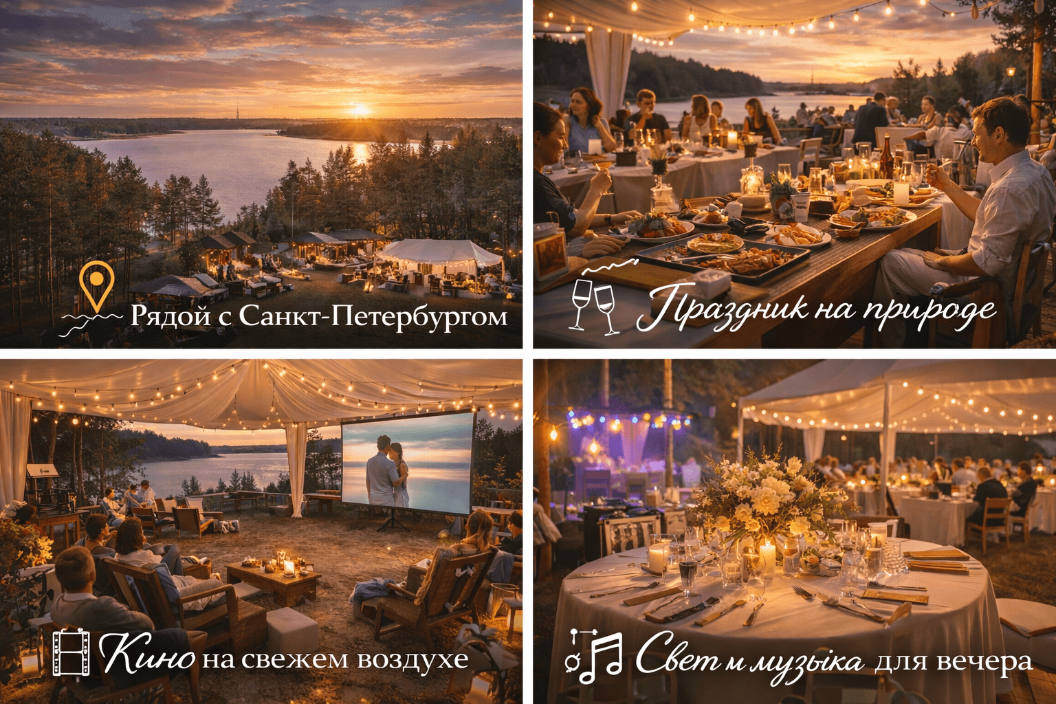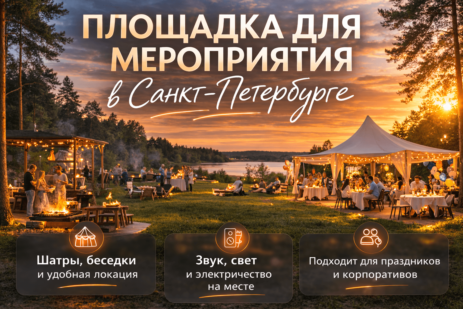 Мероприятие на природе всегда воспринимается иначе, чем праздник в закрытом помещении. Больше пространства, свободная атмосфера, свежий воздух, лесная локация и возможность выстроить событие в более живом формате делают праздник более легким, красивым и запоминающимся. Именно поэтому аренда площадки для мероприятия в Санкт-Петербурге на природе подходит и для камерных встреч, и для больших событий.