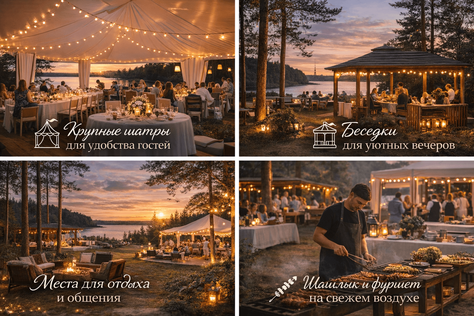 Если нужен более торжественный формат, площадку можно дополнить банкетом. Банкет на природе подходит для мероприятий, где важен полноценный праздничный стол, общая посадка гостей и более выраженная торжественная часть. Такой вариант часто выбирают для юбилеев, взрослых дней рождения, корпоративов, выпускных и семейных событий.