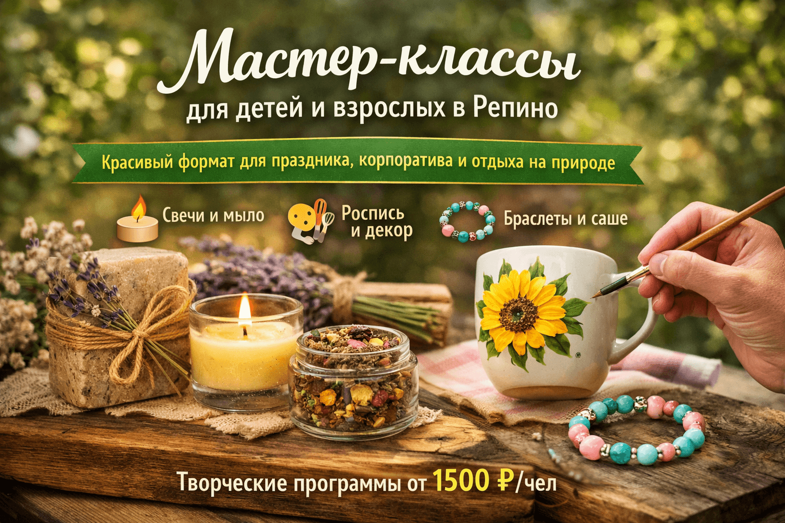 Для взрослых мастер-классы — это стильный и ненавязчивый формат, который помогает объединить гостей, создать уютную атмосферу и сделать мероприятие более интересным. Они отлично подходят для корпоративов, дней рождения, юбилеев, семейных встреч и неформальных событий на природе.