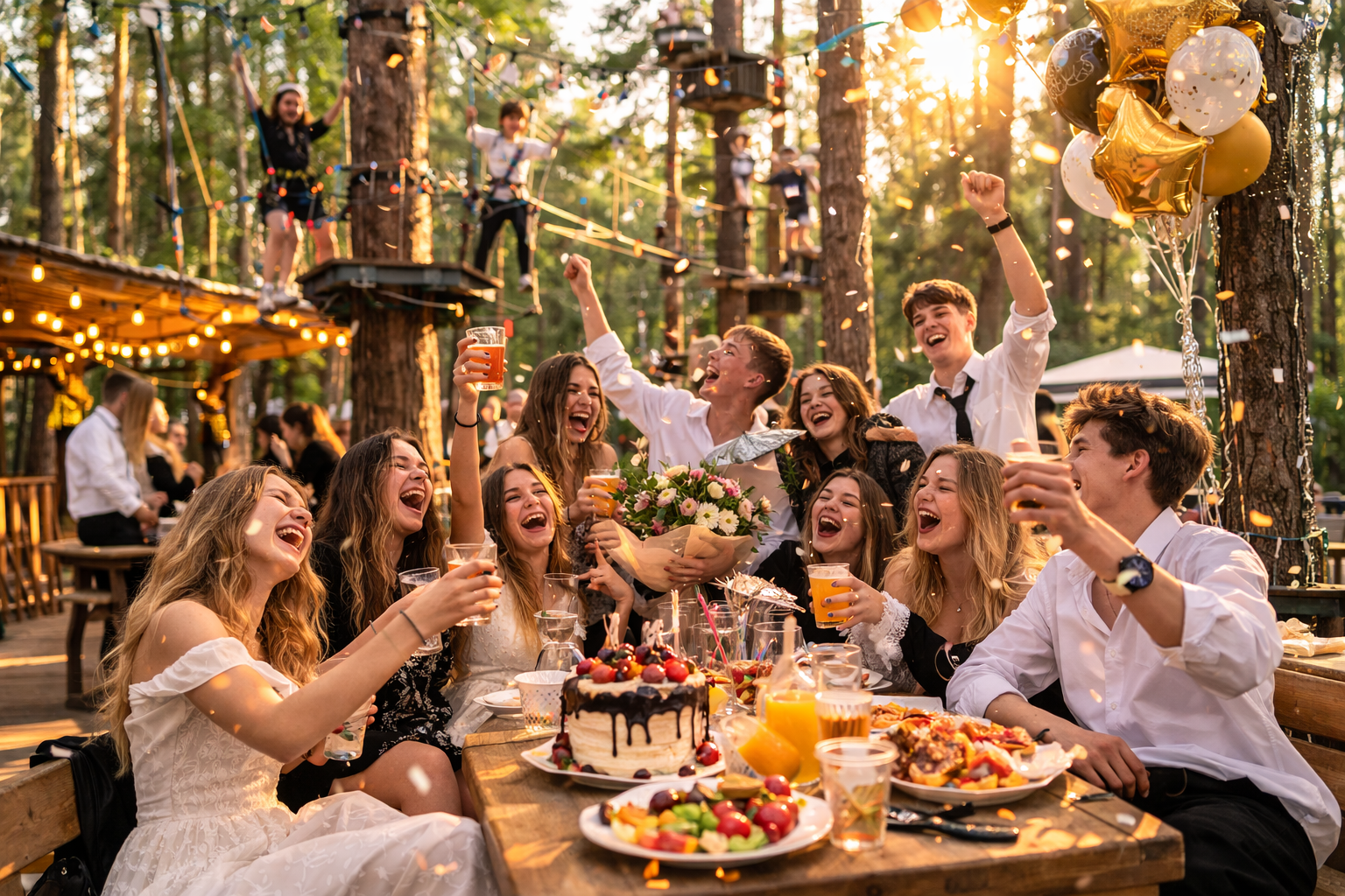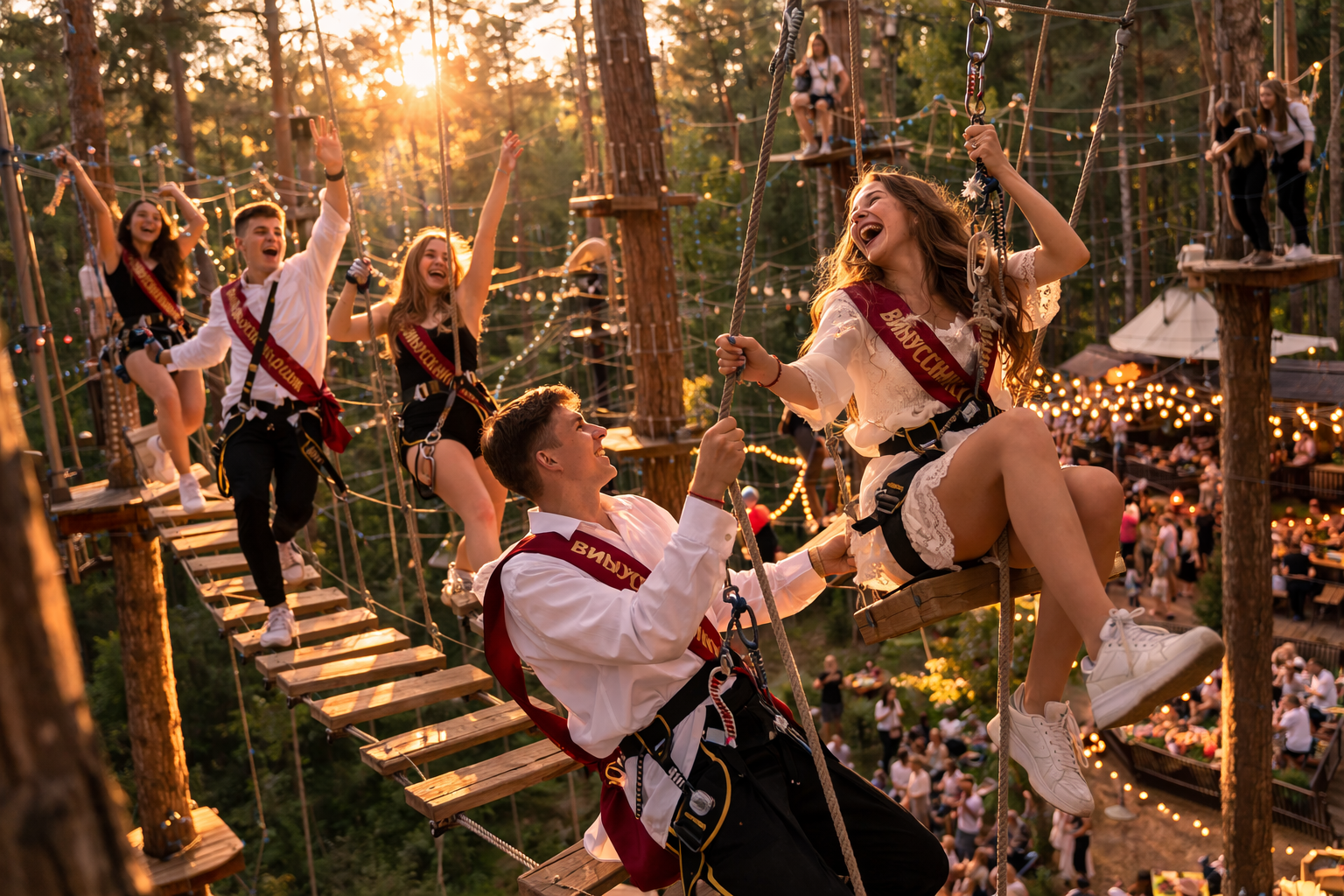 Во-первых, праздник проходит на свежем воздухе. Это особенно важно для больших компаний школьников, которые хотят активно двигаться, играть и веселиться. Во-вторых, выпускной в веревочном парке превращается в настоящее приключение. Вместо обычного застолья участников ждут квесты, соревнования, командные игры и прохождение веревочных трасс. В-третьих, такой праздник объединяет класс. Командные задания помогают школьникам лучше узнать друг друга и почувствовать настоящую командную поддержку.